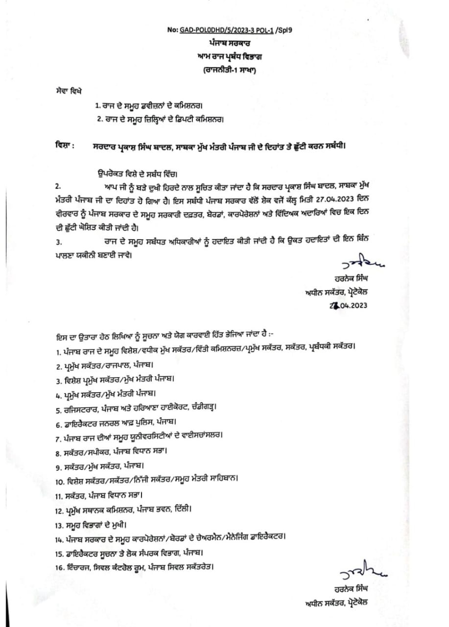 देर रात पूर्व मुख्यमंत्री के निधन की खबर मिलने के बाद आज सूबे के कर्मचारी इस मुगालते में रहे कि शायद आज छुट्टी होगी। सभी घरों में छुट्टी मनाकर बैठे तो इसी बीच पंजाब सरकार का पत्र जब कर्मचारियों के ग्रुपों में आया तो सभी जल्दी-जल्दी में दफ्तरों को भागे। पंजाब सरकार की जारी चिट्ठी में सिर्फ 27 अप्रैल को शोक में छुट्टी घोषित की गई थी।